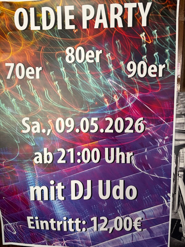 Am Samstag, den 9. Mai ab 21 Uhr Uhr Uhr findet bei uns diesen Monat eine Oldieparty mit DJ Udo statt. Der Eintritt Beträgt 12 €.